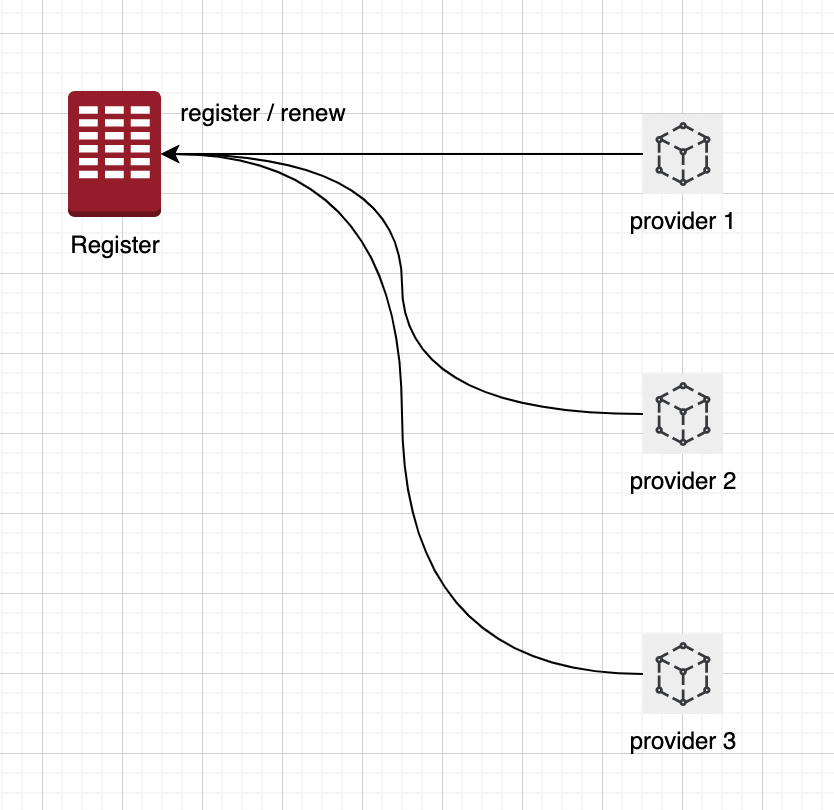 1、Provider 服务提供者:服务向注册中心注册服务信息,即 服务 -> 服务实例 数据模型, 同时定时向注册中心汇报健康检查,如果一定时间内(一般90s)没有进行心跳汇报,则会被注册中心剔除。