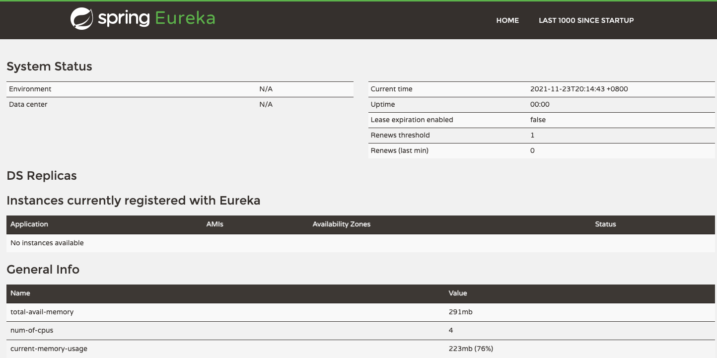 2、Instances Current registered with Eureka:在Eureka Server当前注册的数据,在Spring Cloud生态中,被注册的服务可以呗发现并罗列在这个地方。