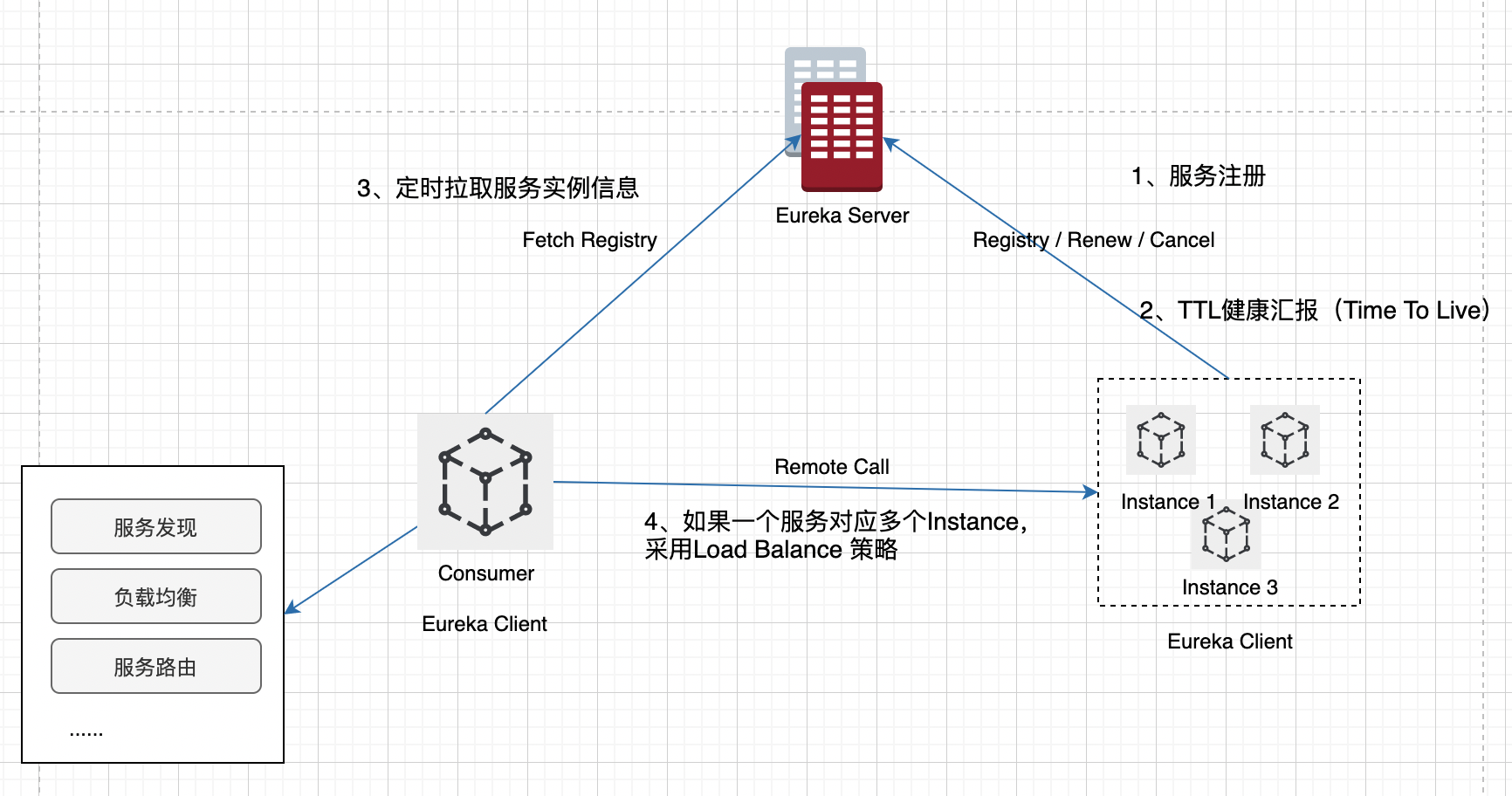 3、Remote Call 远程调用:Consumer从注册中心获取的Provider的实例信息,通过 Load Balance的策略,确定一个实际的实例,发起远程调用。