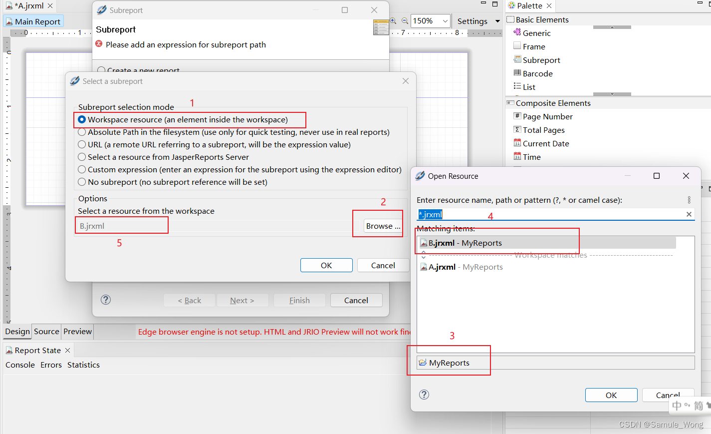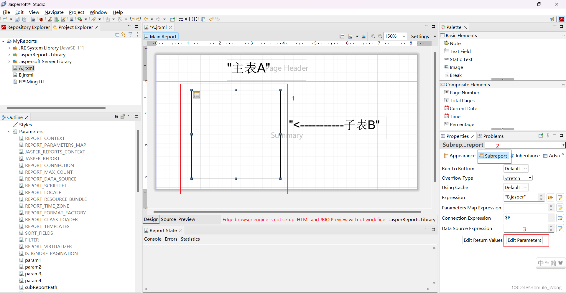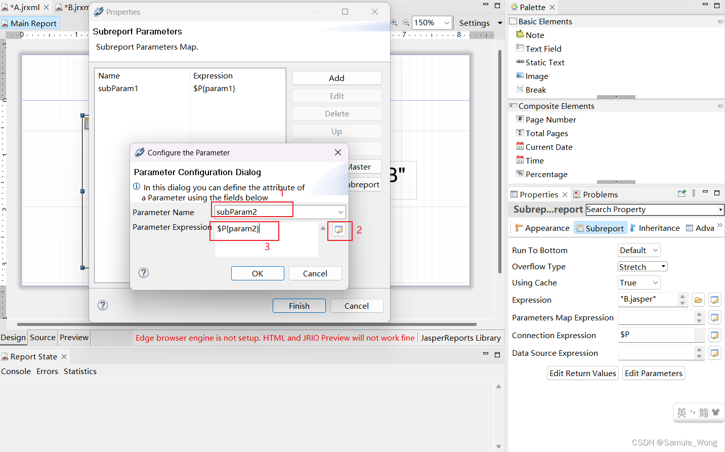 3.假设主表A的Parameters有4个参数需要传给子表B,那么需要点击一下子表B,再点击右下角的Subreport,再点击下方的Edit Parameters,点击add进行添加,Parameter Name填写子表B的参数名,Parameter Expression填写的是主表A的属性名,依次填写好需要传的参数即刻,最后Finshed即可。