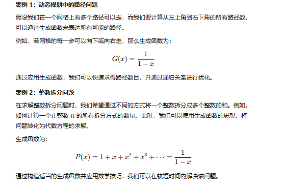 在编程中,生成函数通常与递归和动态规划算法紧密结合。下面是一个经典的动态规划问题——斐波那契数列的生成函数求解示例。