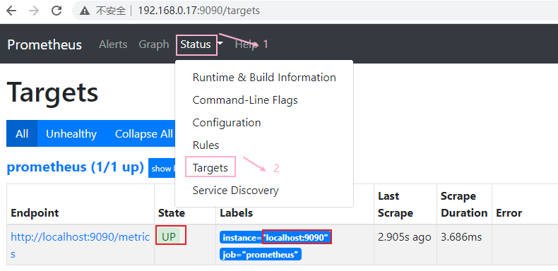 在标签栏的Status-->Targets中可以看到多了一个状态docker (1/1 up);如果新加的target的State是UP的话,就说明监听成功了。