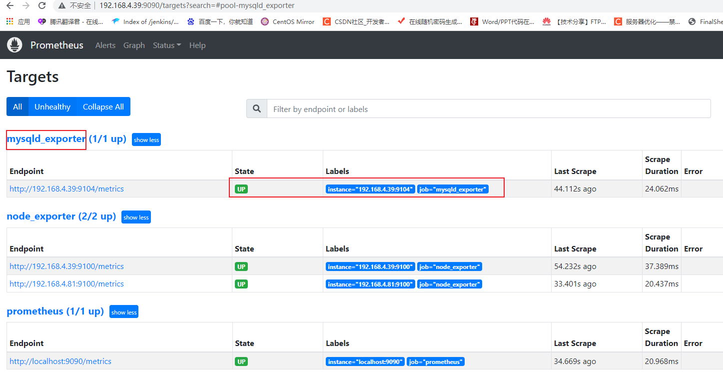 在标签栏的Status-->Targets中可以看到多了一个状态mysqld_exporter (1/1 up);如果新加的target的State是UP的话,就说明监听成功了。