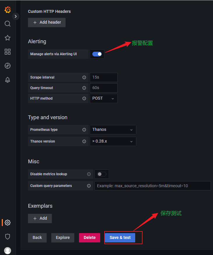 测试并保存,如果此处测试没有问题则返回working,如果有问题,则排查防火墙限制和Prometheus的UI地址。