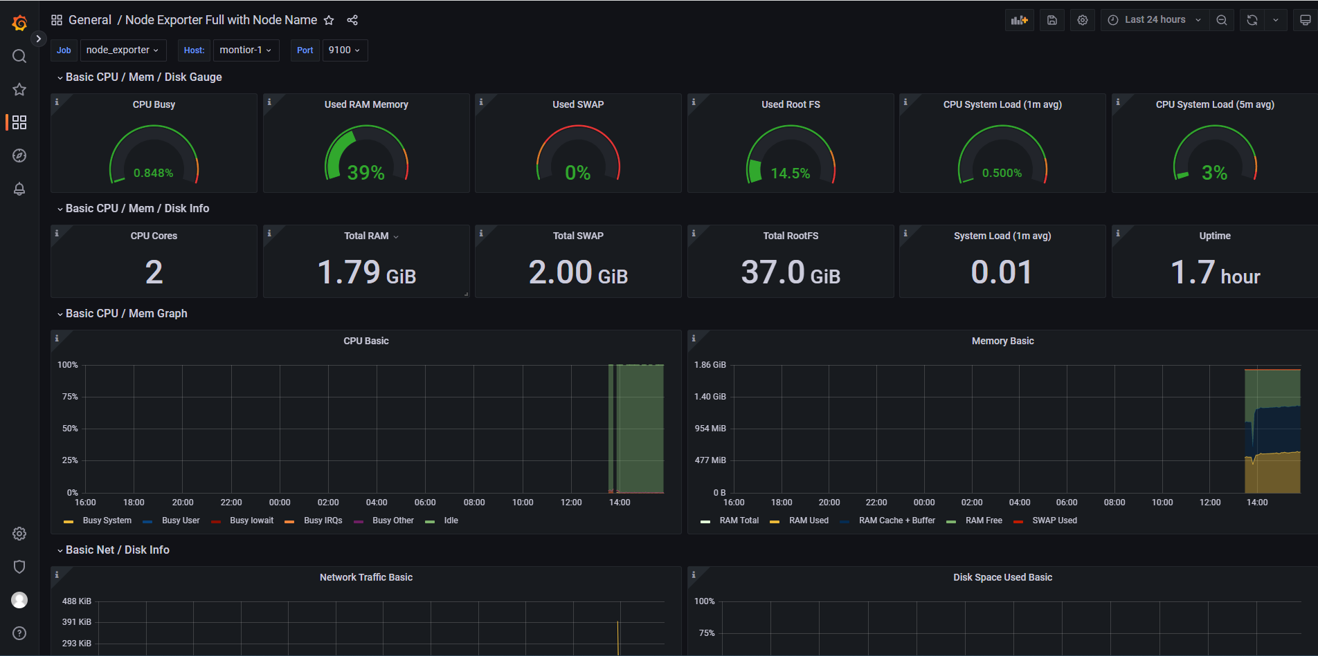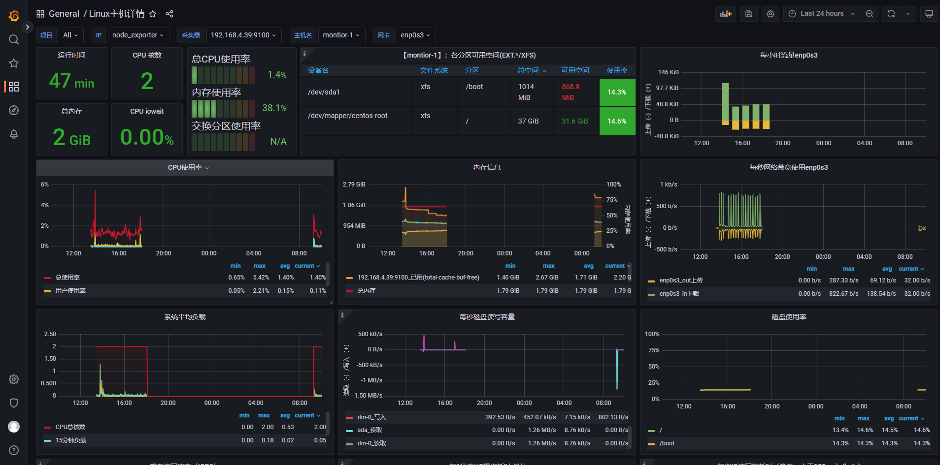 模板导入完成之后,会出现下图,表示Node_exporter的采集数据已通过prometheus数据源在grafana展示成功。