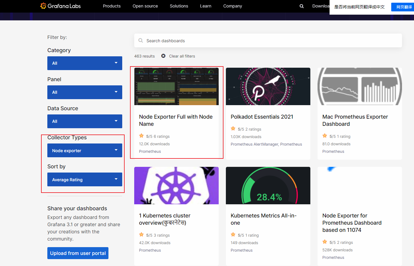 在Grafana的官方面板页面可以看到很多别人配置好的面板,面板中的每个图都是可以编辑的,也可以设置告警。可以在左边根据自己的要求搜索出喜欢的面板样式,一般选择评分高、下载多的。
