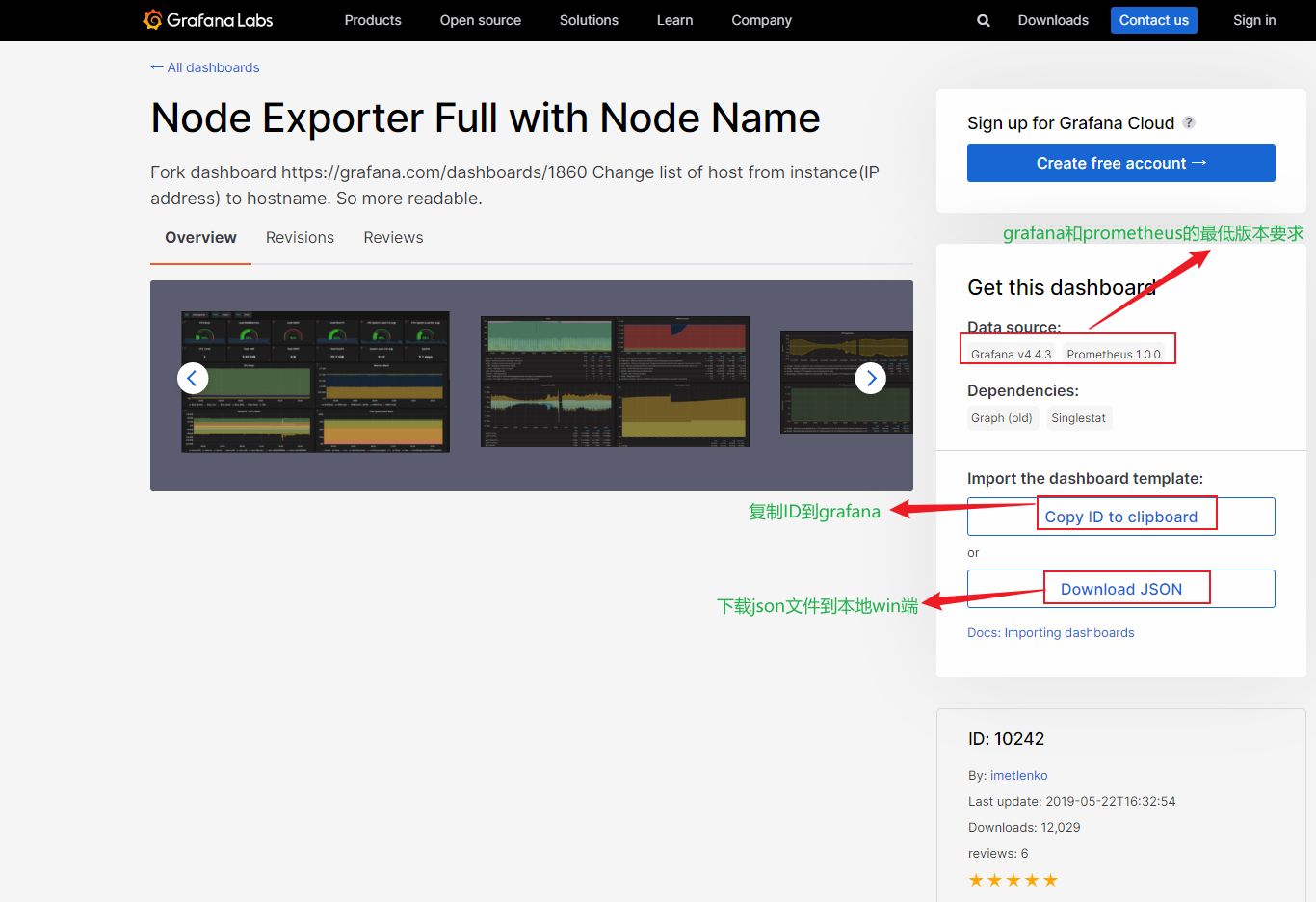 复制面板ID,然后在Import界面输入ID,导入下载好的json文件,并配置Prometheus数据源。
