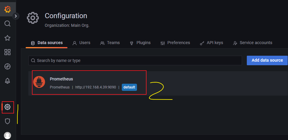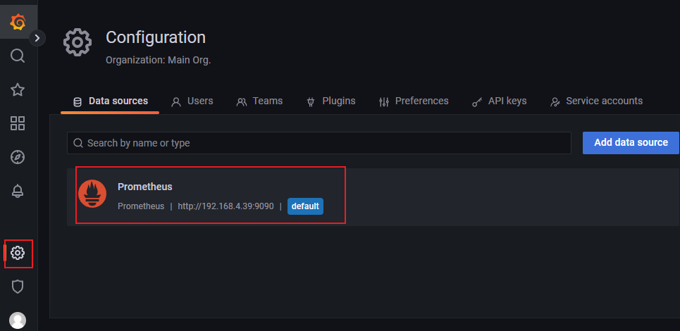 进入grafana后,左边选择设置图标中的Data Source,选择添加Prometheus的数据源。