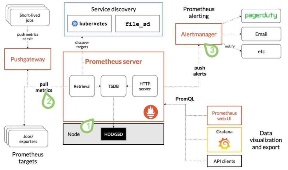 Prometheus 服务器定期从配置好的 jobs 或者 exporters 中获取度量数据;或者接收来自推送网关发送过来的度量数据。