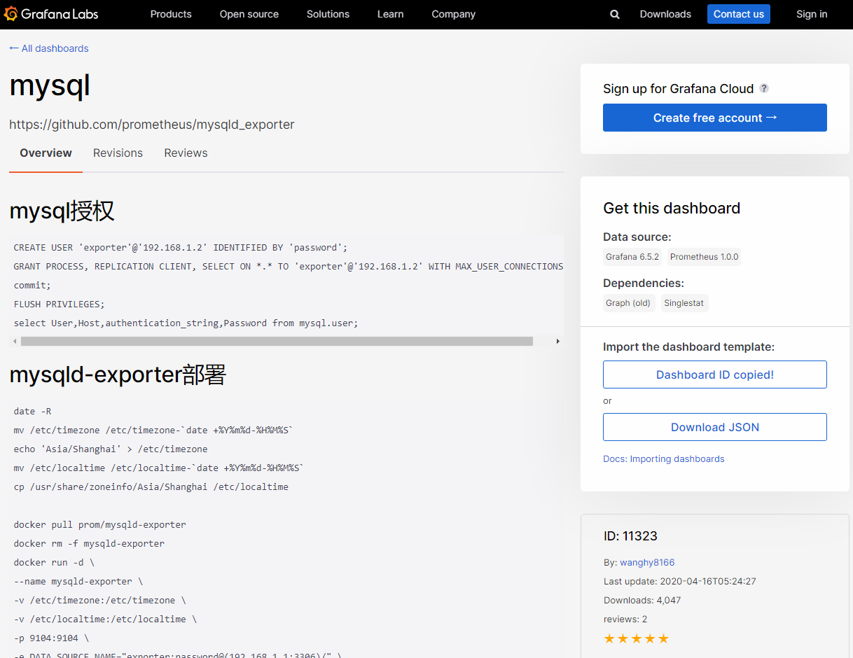 在Grafana的官方面板页面搜索出喜欢的mysqld_exporter面板样式。