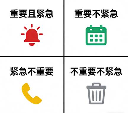 - 逐一判断:针对每个任务,问自己两个问题:“这个任务对实现我的长期目标或核心职责是否重要?”(判断重要性)“这个任务是否有明确的、迫在眉睫的截止时间?”(判断紧急性)。