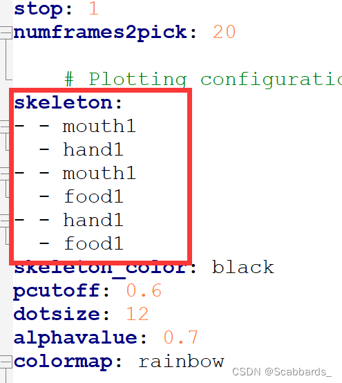 然后这里是图中黑线连接(骨架)的部分,其中嘴到手和食物分别有连线,手到食物也有连线,被连的那个点是两个杠,连它的在下面一个杠