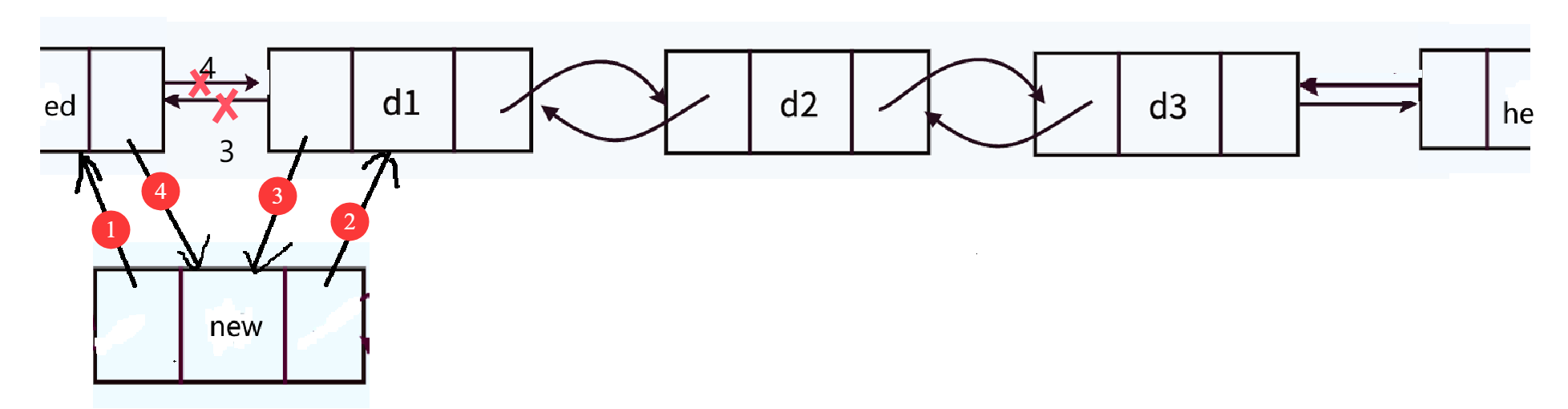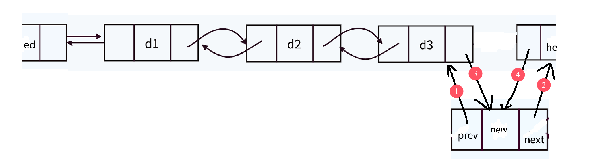 在进行尾插时,最好控制的就是新节点的指向,所以放在第一步进行。之后就是改变尾节点d3的下一项和头结点的上一项,这里需要讲究顺序,需要先改变d3指向new(因为可以通过head找到尾节点),然后再让head的前一项指向new