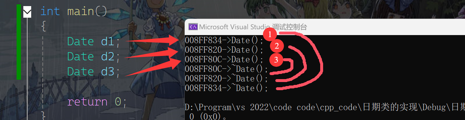 如下,可见后定义的d3最先调用析构函数,先调用的d1最后调用析构函数。