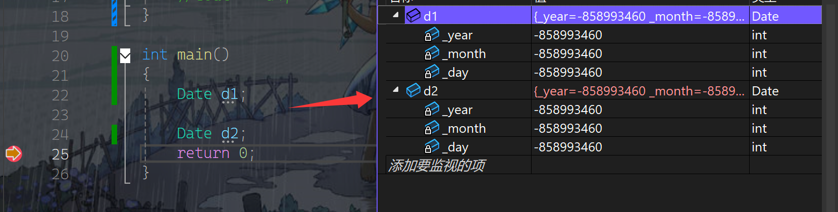 当注释掉上面两个构造函数,再次运行,可以看见VS生成的默认构造函数没有对内置成员变量进行初始化。