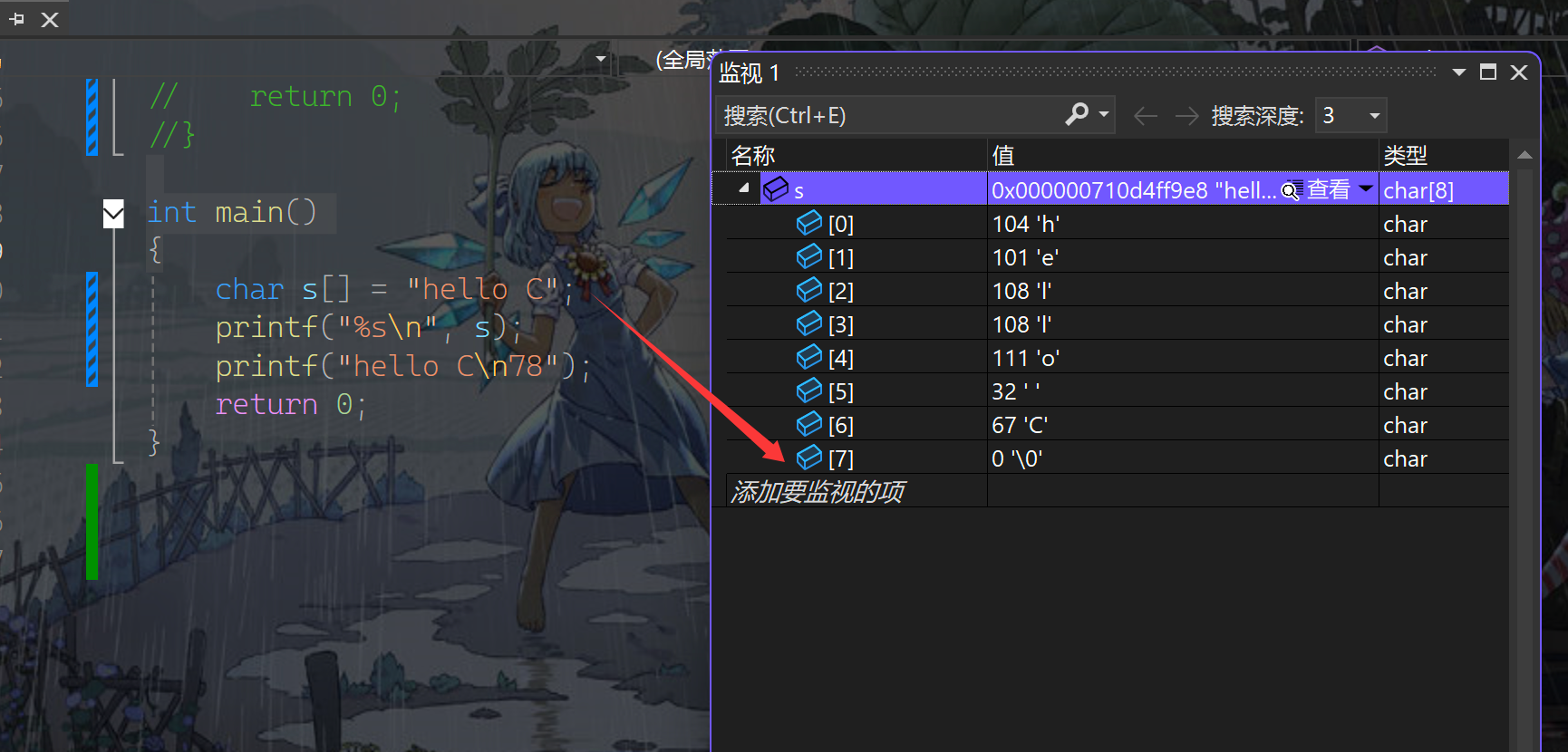 来到调试界面,咱们可以见到在末尾隐藏的\0。