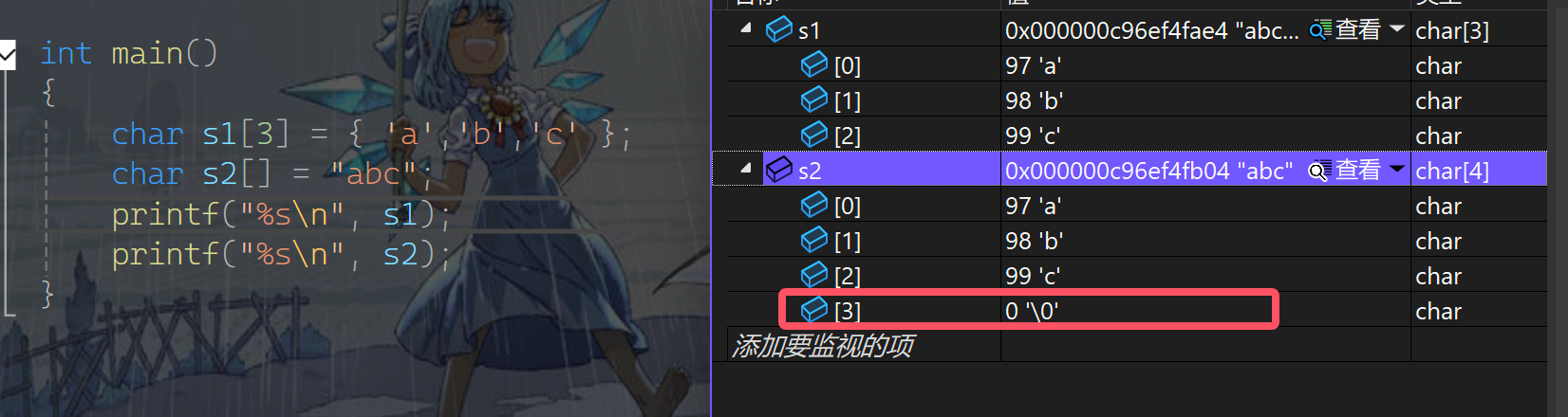 咱们可以来验证一下\0的功能,可以看到s2会比s1多一个\0
