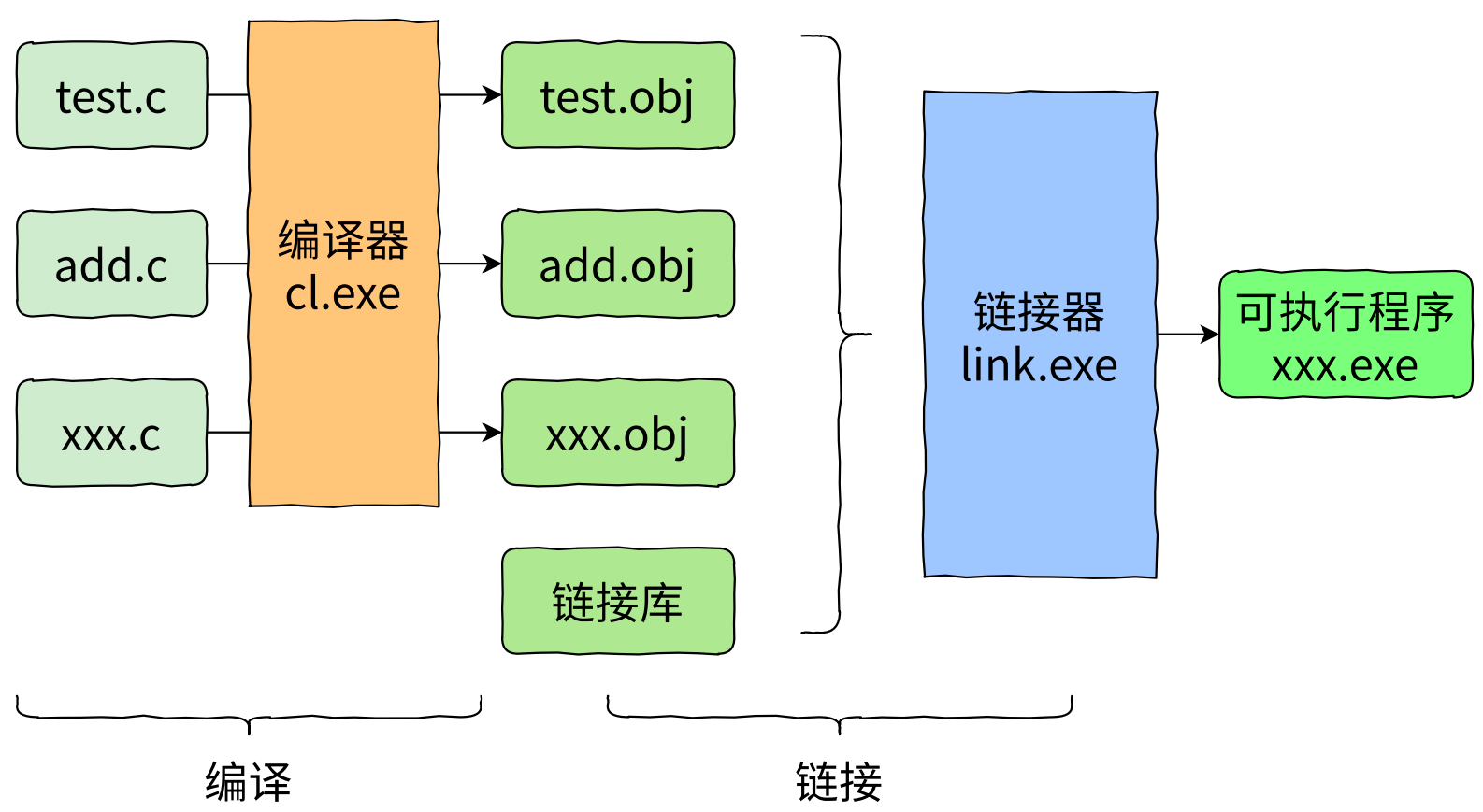 多个目标文件和库文件经过链接器处理生成对应的可执行程序(.exe⽂件)