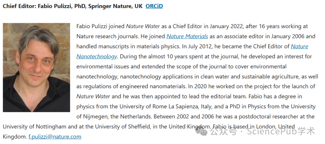 abio Pulizzi 在《Nature》系列研究期刊工作 16 年后,于 2022 年 1 月加入 Nature Water 担任主编。他于 2006 年 1 月加入 Nature Materials 担任副主编,负责材料物理领域的稿件。2012 年 7 月,他成为Nature Nanotechnology的主编。