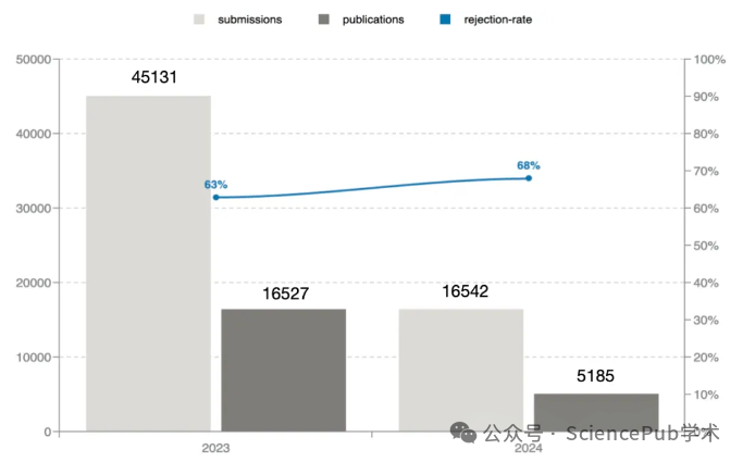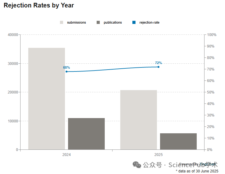 根据官网今年6月底披露的消息,其拒稿率呈现阶梯式上升态势 ——2023年尚为63%,后续先升至68%,今年又攀升至 72%。不少网友反馈:越来越难灌水了!