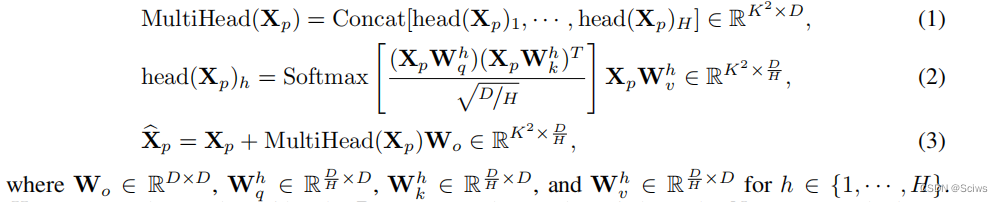研究将特征映射X∈R(N×D)划分为一组不重叠的小窗口:X→{X1,X2,···,XP },其中每个窗口的大小为K×K。在每个窗口内独立地执行多头自注意(MHSA)。在第p个窗口上的多头自注意的公式为: