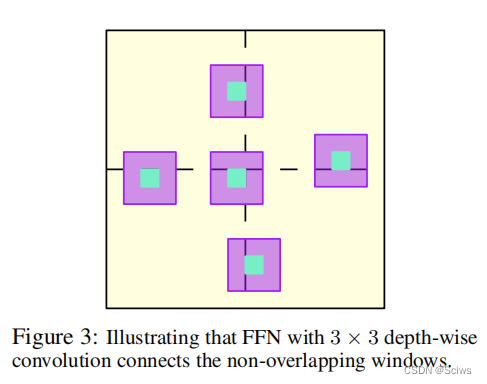局部窗口的自注意分别在不重叠的窗口上进行自注意操作。这些窗口之间没有信息交换。为了处理这个问题,在形成FFN中的两个点MLP之间添加了一个3×3深度卷积: MLP(DW-Conv.(MLP()))。图1的右侧显示了一个使用3×3深度卷积的FFN如何更新2维输入特征的例子。