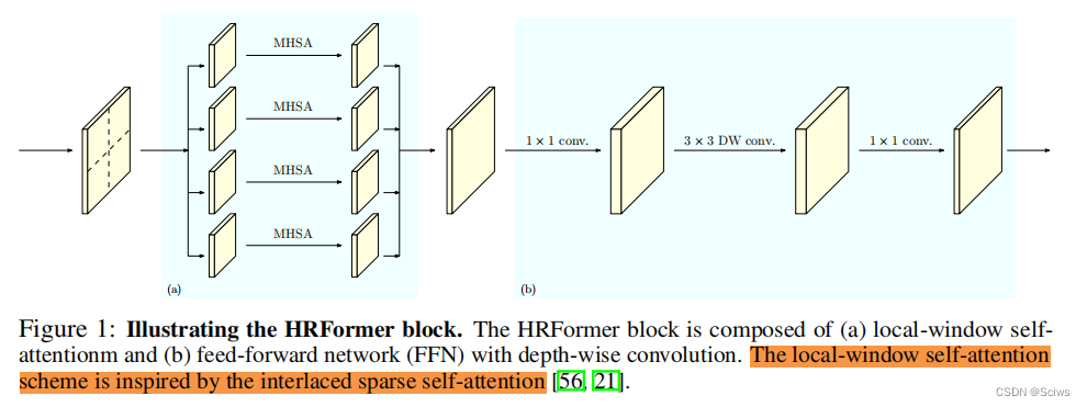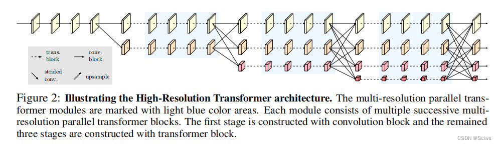 图2说明了整个HRFrormer架构。卷积多尺度融合模块的设计完全遵循HRNet。