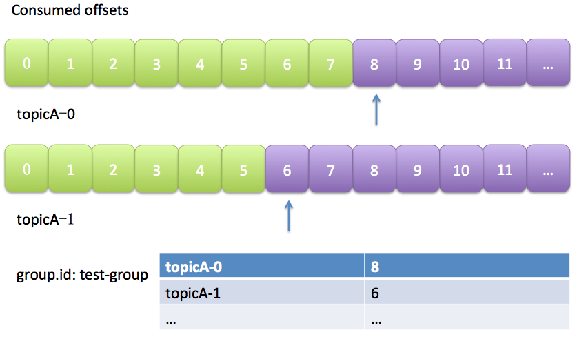 kafka默认是定期帮你自动提交位移的(enable.auto.commit=true),你当然可以选择手动提交位移实现自己控制。另外kafka会定期把group消费情况保存起来,做成一个offset map,如下图所示: