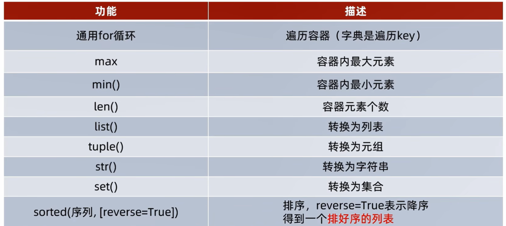 sorted(容器,(reverse = true)若要倒序排序则加入括号内内容):排序后放入列表中
