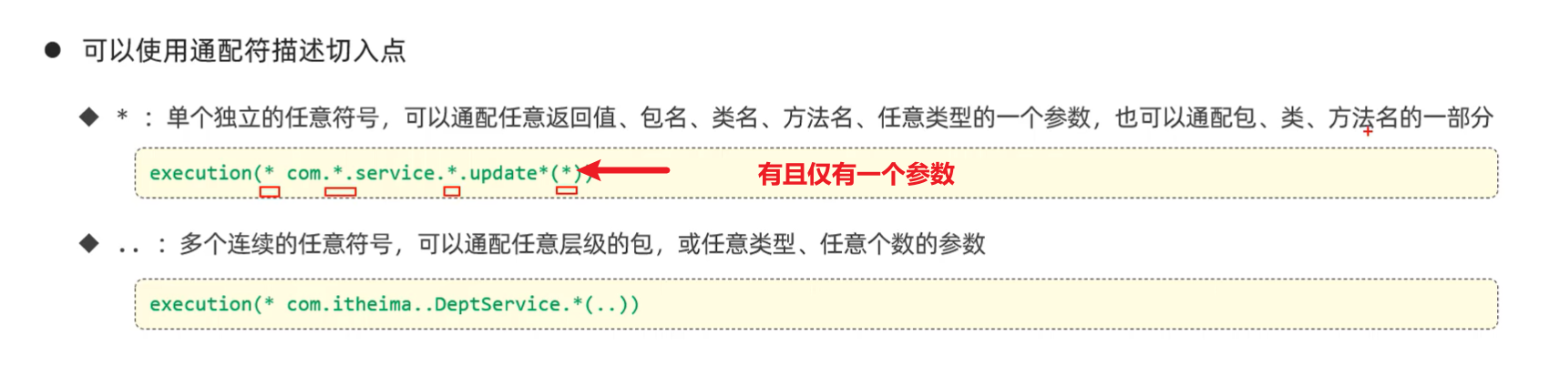 | 方法参数 | execution(* com.app.Service.method(..)) | 匹配 method 方法,不论它有没有参数,或者参数是什么类型。 (..) 是最常用的参数匹配方式。 |