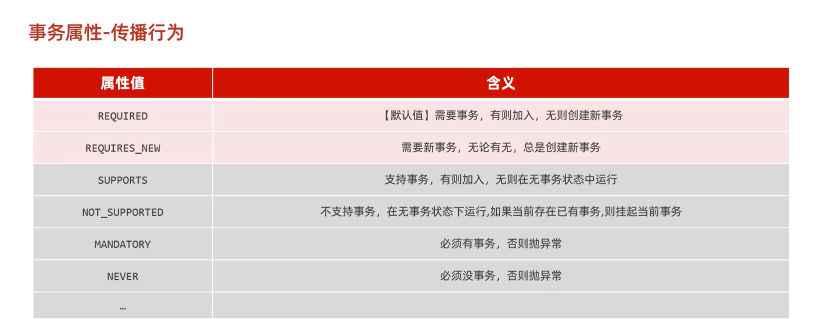 @Transactional(propagation = Propagation.REQUIRES_NEW)/* 当被事务调用时,该方法会创建一个新事务