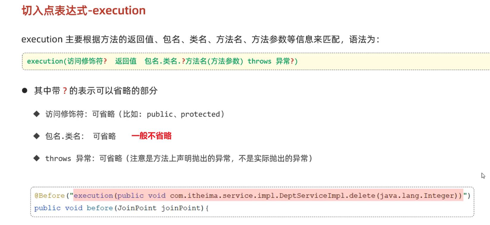execution(...)表达式,如你在@Around中定义的execution(* com.itheima.service.*.*(..))。