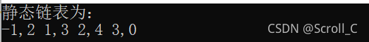 提示,此代码创建了一个带有头节点的静态链表,因此最先输出的 "-1,2" 表示的是头节点(-1表示此处未存储数据),其首元节点(存储元素 1 的节点)在数组 array[2] 中。