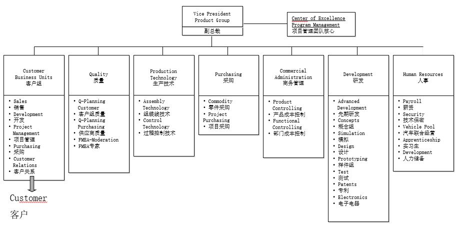 实体对象的开发需要采购,核算,样件,测试,物流,质量,生产等部门以及外部供应商们的协作。各职能部门由于人员,设备的限制,资源由各开发项目共享。你的项目任务是公共职能部门手里众多项目中的一个,灵活性受到限制。如图5所示,是汽车零部件企业典型的组织架构。