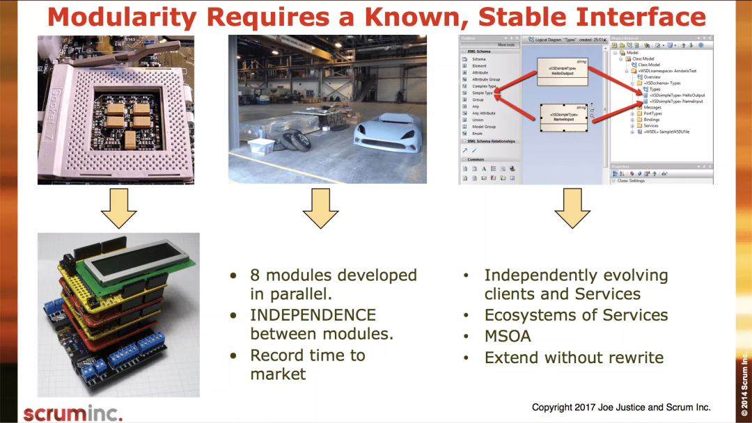 最终产品应该在一周内生产出来。任何感兴趣的利益相关者和合规检查官可以通过每周的检查来减少风险,因此也就没有必要通过把硬件项目拆分为几个阶段来降低风险。在团队还不具备这样做的技术的情况下,我们可以将产品分解为模块,以隔离周期长的、复杂的、或管制程度高的部分。硬件项目“切片”的划分方式很重要。每个团队都应该能够验证关于他们模块的假设,而不依赖于其他团队。例如,当一个团队可以独占汽车外部件时候,汽车风阻的测试就会做得更好。使用模块还可以分隔测试和认证周期最长的区域,以便其它的部分能够更快地迭代和获批。