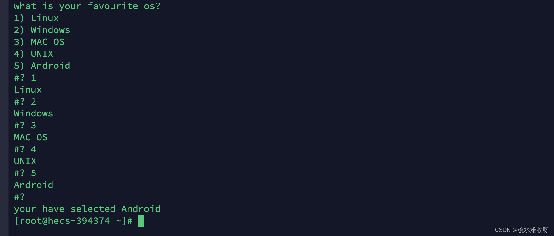 select name in "Linux" "Windows" "MAC OS" "UNIX" "Android"