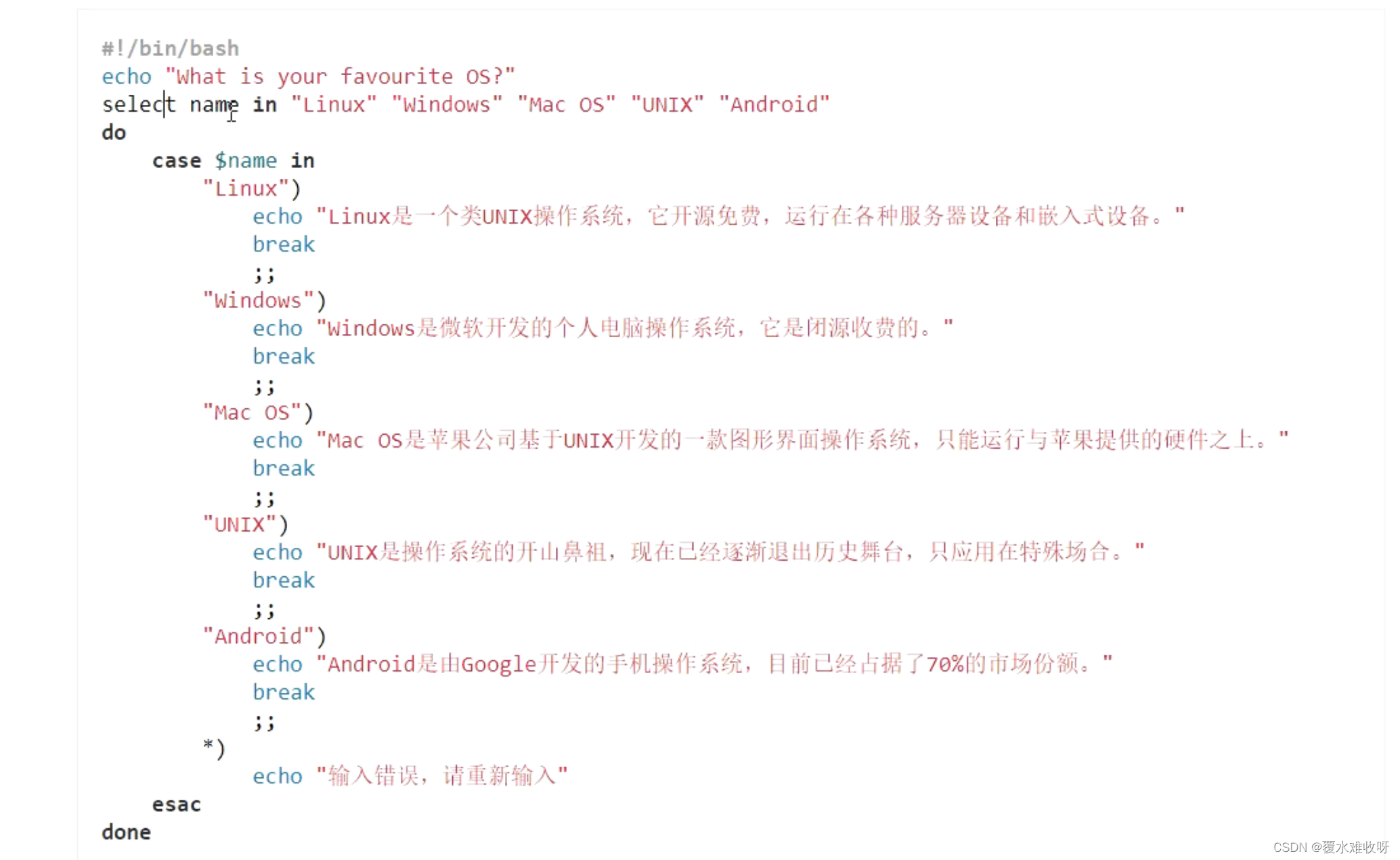 select in 循环用来增强交互性,它可以显示出带编号的菜单,用户输入不同的编号就可以选择不同的菜单,并执行不同的功能。