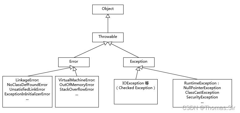 第一,理解 Throwable、Exception、Error 的设计和分类。比如,掌握那些应用最为广泛的子类,以及如何自定义异常等。很多面试官会进一步追问一些细节,比如,你了解哪些 Error、Exception 或者 RuntimeException?我画了一个简单的类图,并列出来典型例子,可以给你作为参考,至少做到基本心里有数。