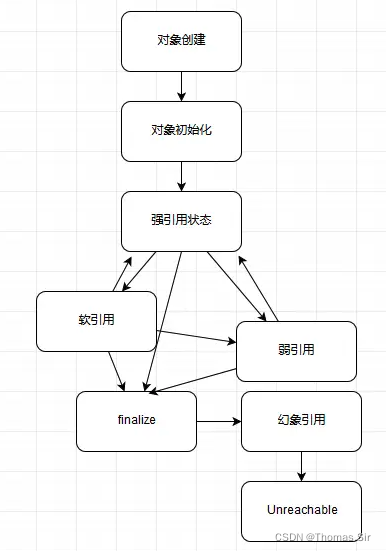 知识扩展1. 对象可达性状态流转分析首先,请你看下面流程图,我这里简单总结了对象生命周期和不同可达性状态,以及不同状态可能的改变关系,可能未必 100% 严谨,来阐述下可达性的变化。