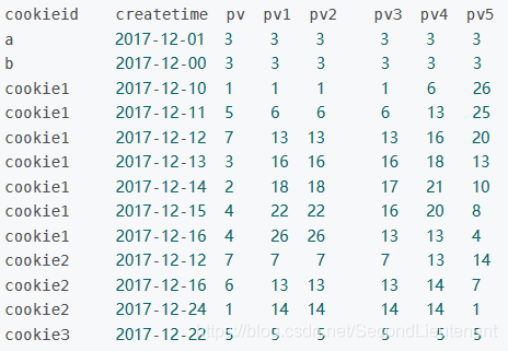 SELECT cookieid,createtime,pv,