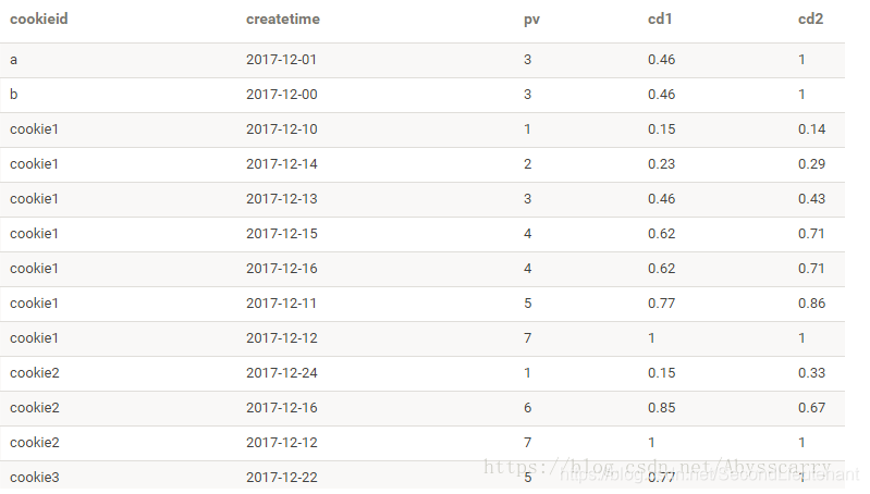 round(CUME_DIST() OVER(PARTITION BY cookieid ORDER BY pv),2) AS cd2
