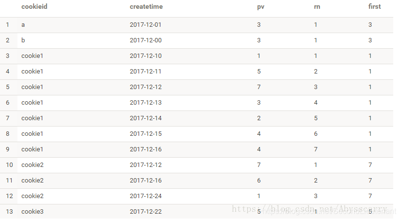 ROW_NUMBER() OVER(PARTITION BY cookieid ORDER BY createtime) AS rn,