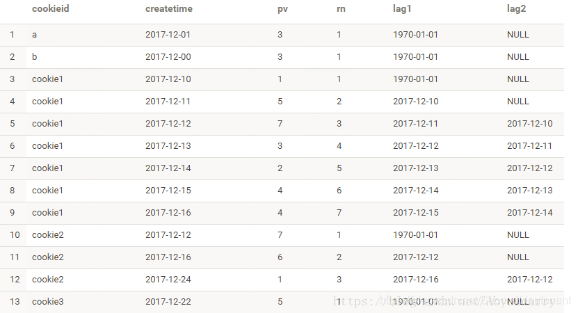 LAG(createtime,1,'1970-01-01') OVER(PARTITION BY cookieid ORDER BY createtime) AS lag1,