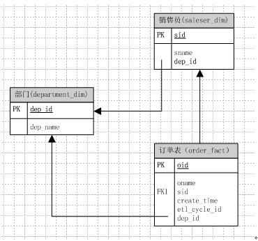 看上去好像不错哦~~,取数据也就一句sql就搞掂了,但是却是最最槽糕的情况,有可能一个销售员,前几天登记的部门是a,但是其实他的所属于的部门为b,那么对于上面这个模型,我们得改动销售员和订单表;而对于上面的其他两个模型都仅仅需要改动一张表就行了,造成查询数据部一致往往也就是这种数据模型所造成的。