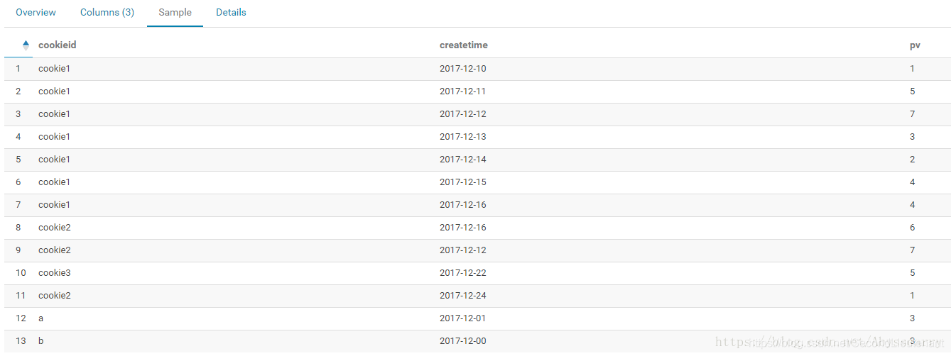 测试表 test1 只有三个字段 cookieid、createtime、pv
