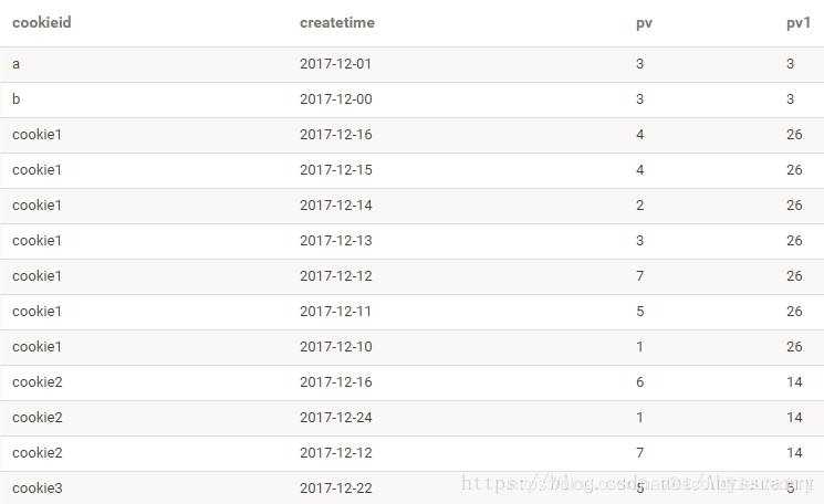 sum(pv) over(PARTITION BY cookieid ORDER BY createtime) as pv1