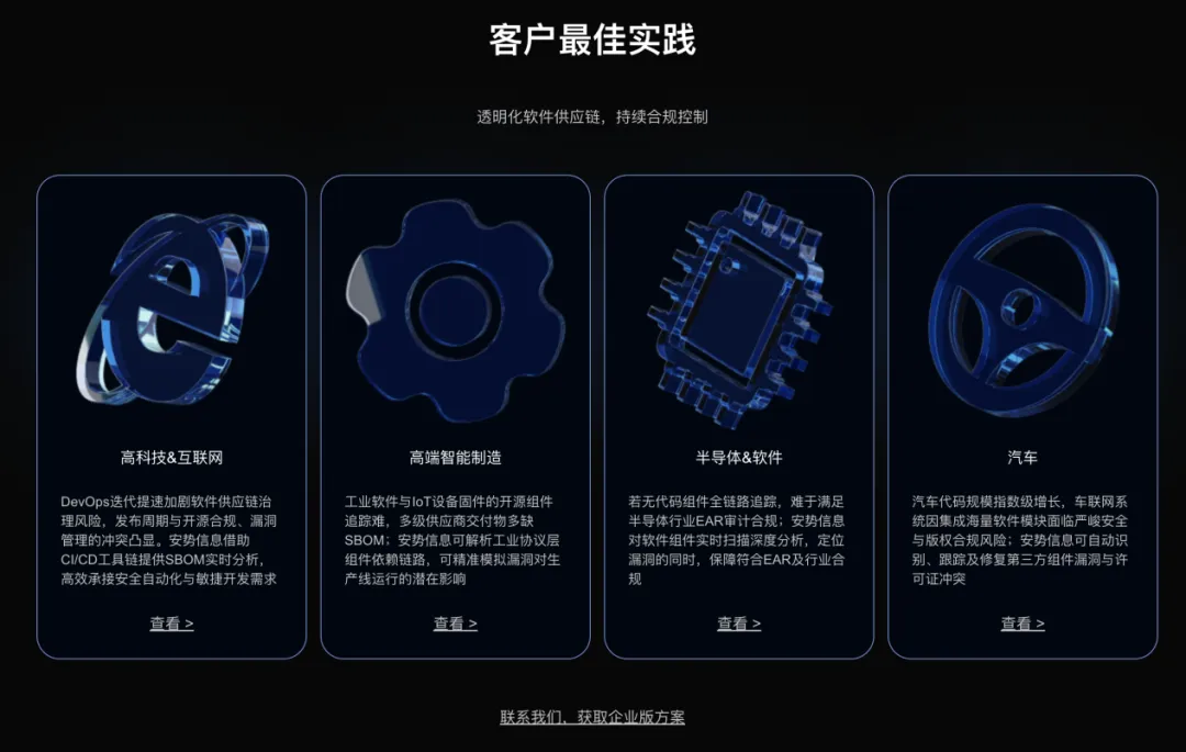 深度垂直互联网、高端智能制造、汽车、半导体四大关键领域,针对各行业开源依赖特性与合规要求,定制化呈现“行业痛点-解决方案-客户价值-客户案例”的落地路径,实现从“通用能力”到“场景适配”的精准衔接。
