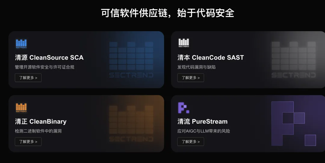 另外,我们此次更新的官网中我们嵌入了清源 CleanSource SCA 社区版的登陆页面:https://cleansource-ce.sectrend.com.cn/login