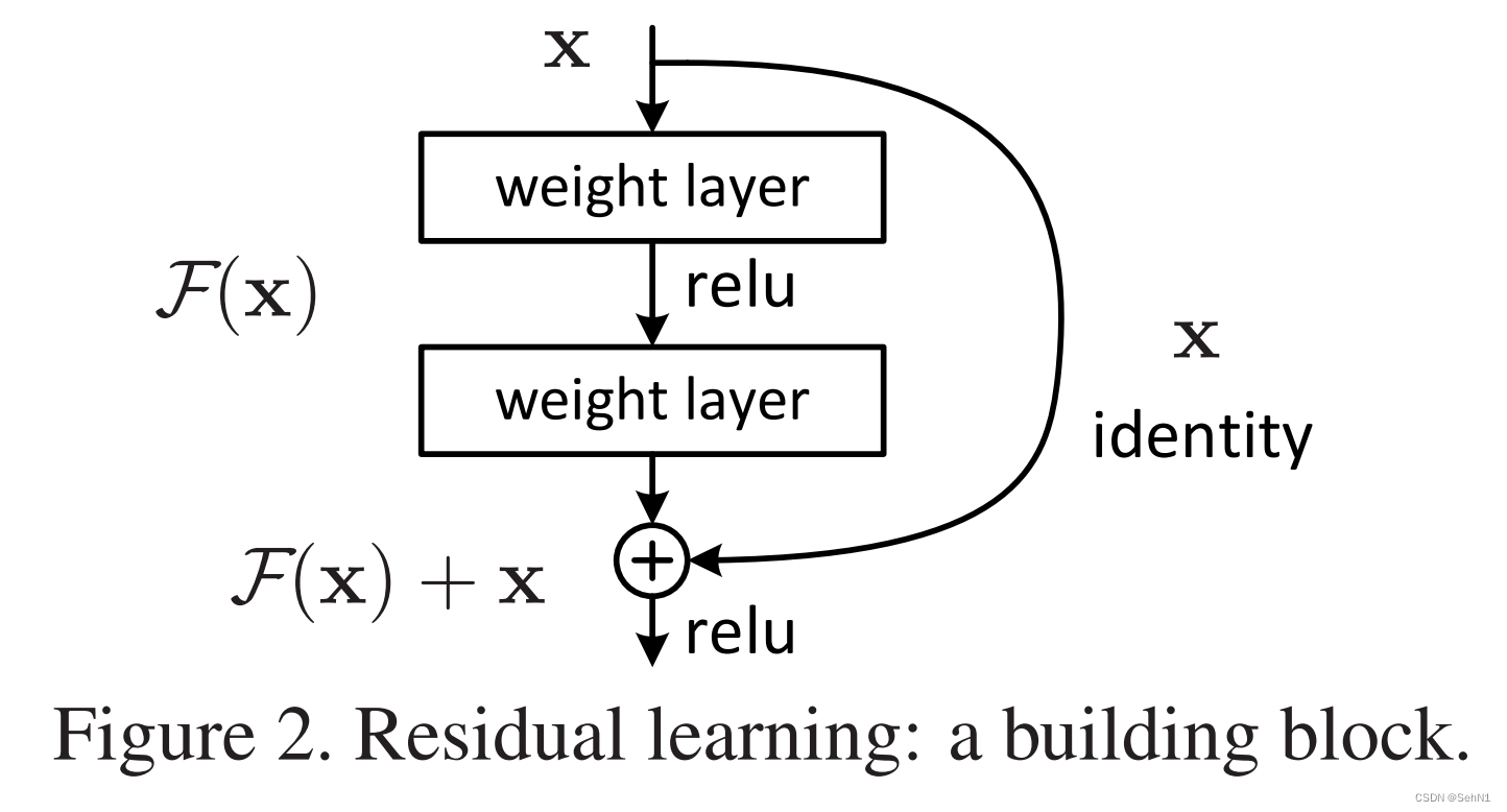 如图3所示,残差学习的关键思想是引入一个捷径(shortcut)。与以往的神经网络模型每一层学习的是一个 y = f(x) 的映射不同,残差学习每一层的映射关系为y = f(x) + x,也就是将每一层的输入直接加入到该层的输出中。有了这样的shortcut,当深层网络中的某一层存在梯度消失问题时,梯度可以通过shortcut直接“跳过”该层,直接传播到更浅一层,这样就有效的缓解了梯度消失问题,也就可以实现更深层次的网络来提高模型的整体性能。如果对于某个输入x,f(x)学到了一个接近于零的映射,那么y就接近于x,此时,残差块可以近似地执行恒等映射,进行更加灵活的非线性学习,而不是被迫的学习一个复杂的映射,增加不必要的复杂性。除此之外,恒等快捷连接既不增加额外的参数,也不增加计算复杂度,可以轻松实现,不会给运算带来额外的负担。