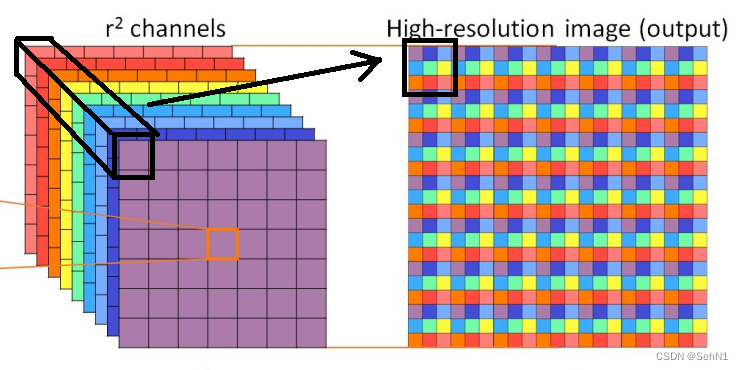 子像素卷积的原理如图5所示。左半部分Hidden layers为卷积神经网络(Convolutional Neural Networks, CNN),右半部分Sub-pixel Convolution layer则为子像素卷积。假设我们要对一个低分辨率图像放大r倍,那么就可以先通过卷积神经网络生成r^2个通道的特征图,再使用像素清洗将这r^2个通道的特征图以特定的方式进行排列,即可得到一张大图。由此可见,子像素卷积的核心步骤通常位于网络的最后一层,其名字里虽有卷积二字,却并没有进行卷积运算,而是进行简单的周期性排列(如图6所示)。
